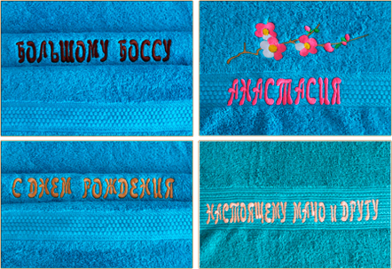 Пушистое полотенце с эксклюзивной вышивкой может стать хорошим подарком. На полотенце можно вышить имя, любые поздравления и напутствия. Широкое распространение получила вышивка на полотенцах для гостиниц, фитнес-центров, SPA-салонов, которая становится рекламой бренда.